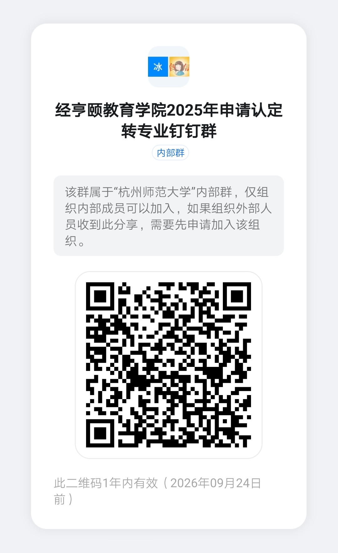 各位同学 根据《杭州师范大学本科生转专业实施办法》(杭师大办〔2024〕34号)文件要求,请拟申请转经亨颐教育学院的同学,依据《经亨颐教育学院2025年申请认定转专业工作考核方案》(附件1)要求,提交转专业申请表(附件3)。提交地点:下沙行政楼213,仓前诚园6-331。报名同学请扫码加入经亨颐教育学院2025年申请认定转专业钉钉群。