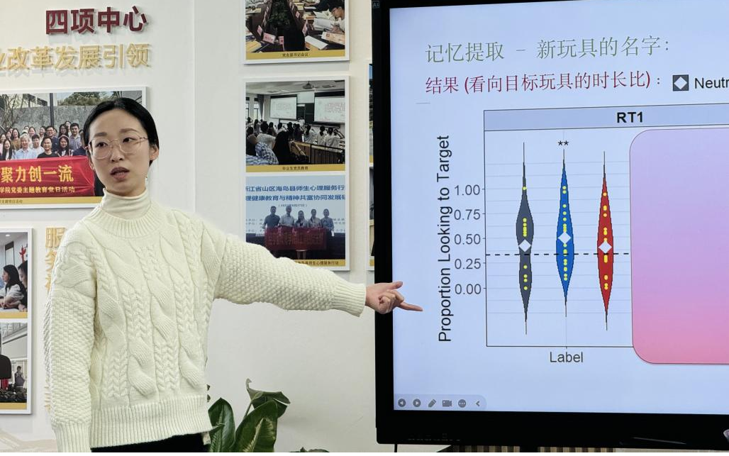 沙龙第二位主讲人是马俐智博士。马老师主讲的题目是“感知情绪对幼儿词汇习得的影响”。马老师指出,研究用眼动追踪开展两项实验,考察29–31个月英国幼儿在参照物选择任务中对中性/积极/消极情绪语调呈现的“新词—物体”与“情绪—物体”联结的保持。结果显示:无论伴随的情绪语调为何,幼儿都能学会“新词—物体”配对;但当情绪线索出现时,他们对消极物体表现出显著注意偏向。这表明,根据名称指认目标物是一个竞争过程:已学“词—物”联结的记忆提取会与情绪性干扰物(尤其消极情绪性)的吸引力相竞争。韩柽炀老师关注控制组在儿童情绪与词汇识别中的作用。一位研究生就颜色对儿童判断事物产生的正性或负性影响与马老师进行了对话交流。胡玥老师就该研究中的小提琴图所代表的形状含义与马老师进行了对话交流。钱旭鸯老师就情绪表达的夸张程度问题与马老师进行了对话交流。