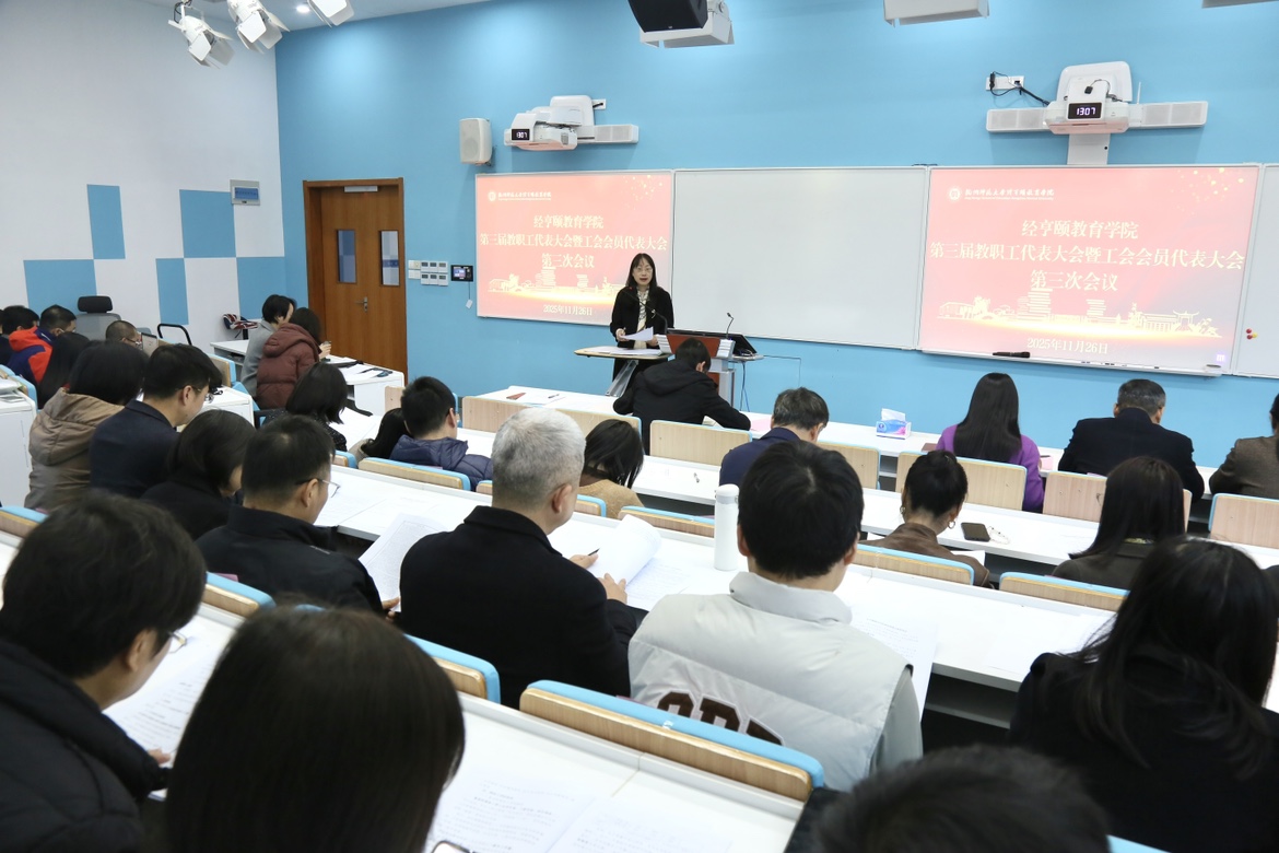 11月26日,杭州师范大学经亨颐教育学院第三届教职工代表大会暨工会会员代表大会第三次会议,在诚园6-112会议室隆重举行。本次会议是学院在深化内部治理、推动高质量发展关键时期召开的一次重要会议,主要议程为审议《经亨颐教育学院绩效工资实施办法(草案)》。大会由学院工会主席陈红主持。
