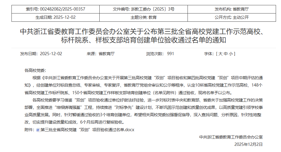 近日,浙江省教育厅公布了第三批全省高校党建“双创”项目验收通过名单,学院党委顺利通过全省高校党建工作标杆院系项目验收,教工第一党支部顺利通过全省高校党建工作样板支部项目验收。