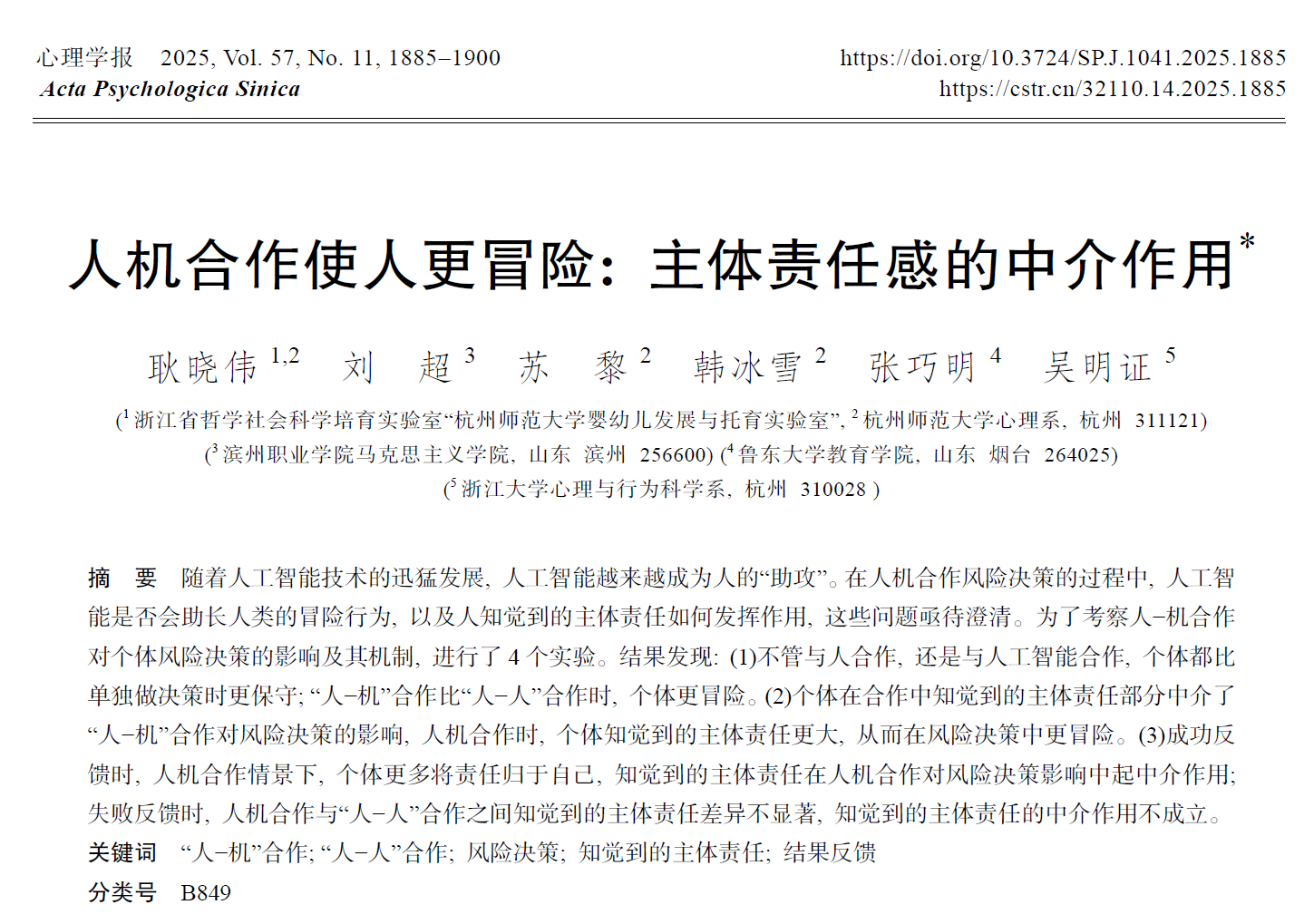 近日,我院心理学系耿晓伟教授团队在心理学权威期刊《心理学报》上发表题为“人机合作使人更冒险: 主体责任感的中介作用”的论文,探索人机协作是否会使人更冒险及其影响机制。