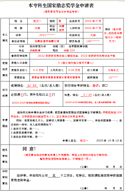 附件2:励志奖学金样表及填写说明