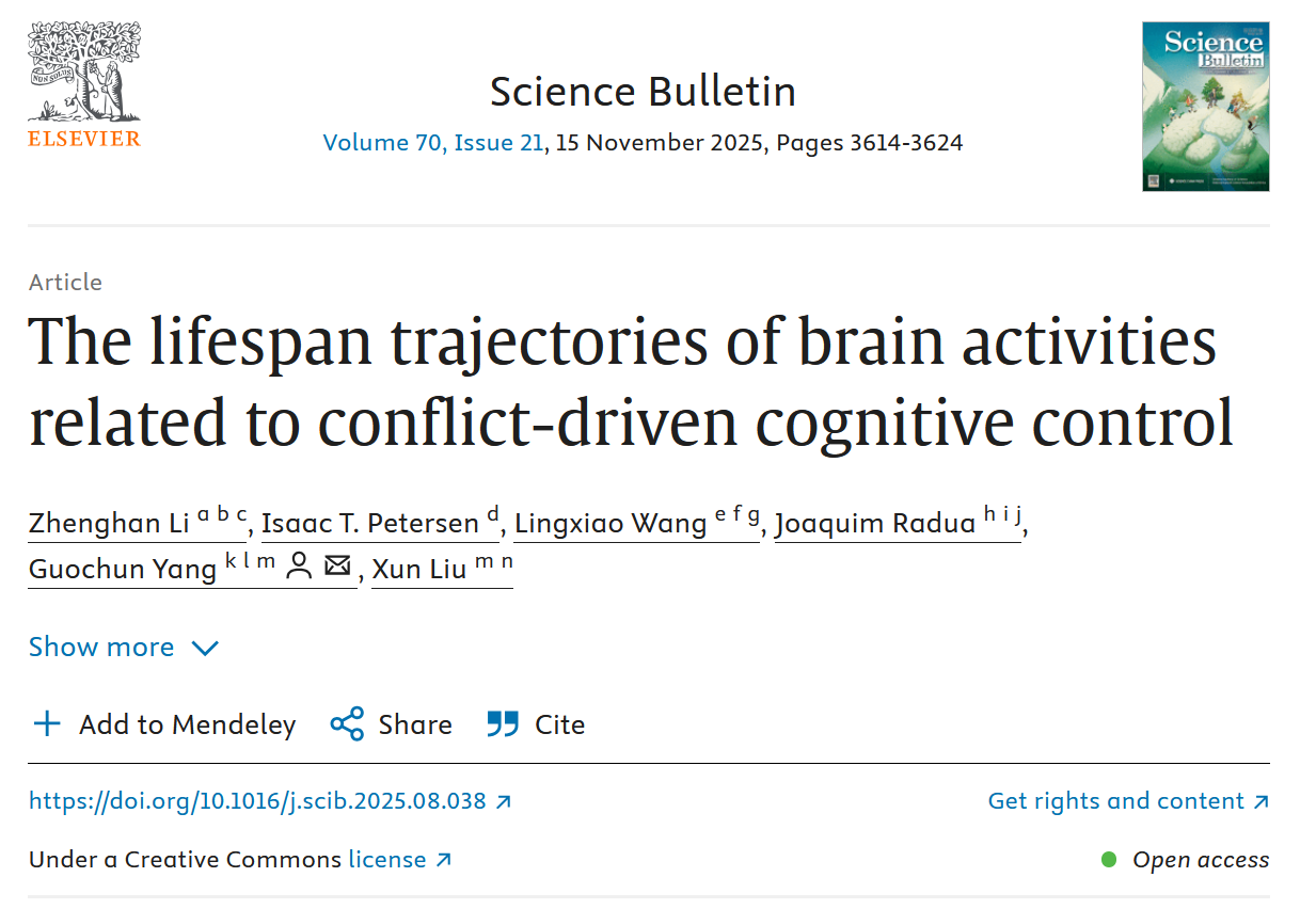 近日,我校脑科学研究所李政汉老师与广东省智能科学与技术研究院杨国春研究员合作,在Science Bulletin发表了题为“The Lifespan Trajectories of Brain Activities Related to Conflict-driven Cognitive Control”的研究论文。该研究发现,认知控制过程中的大脑活动随年龄产生有规律的变化,表现为倒U型的毕生发展轨迹:从童年期开始上升,于27-36岁期间达到峰值,随后在成年后期逐渐下降。此外,研究还发现,相较于成年人,儿童和老年群体的大脑活动均表现出显著的左偏侧化倾向。该研究填补了认知控制相关的大脑活动毕生发展研究领域的空白。