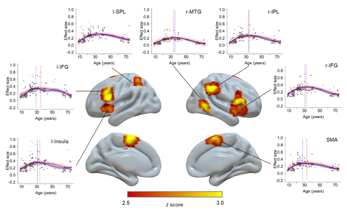 图1. 认知控制相关的大脑活动的毕生发展轨迹